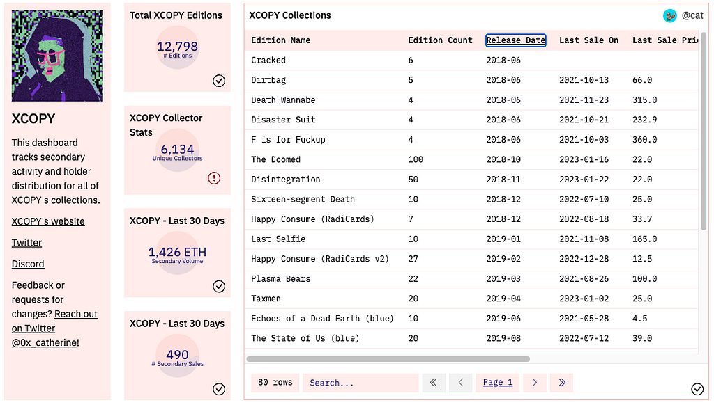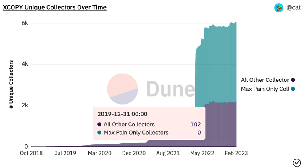 - xcopyの複数部限定で鋳造されたコレクションは全てを合わせておよそ13,000点、所謂ジェネレーティブNFTとして10,000鋳造が一般的であったPFP NFTプロジェクトに近い数のNFTを個人アーティストとして鋳造しています。なお、xcopyは多種多様なコレクションを制作してその全体像を成しているわけですからPFP NFTプロジェクトとはその内訳が全く異なります。その作品群の多様性がホルダーの多様化につながり、上述の収益安定化を支えている可能性があります。