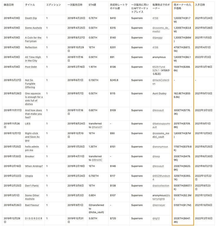 ちなみにですが、この当時に鋳造販売された1/1NFTのセカンダリーマーケットでの執筆時点までの最終流通価格は上記オレンジ枠の通りです。