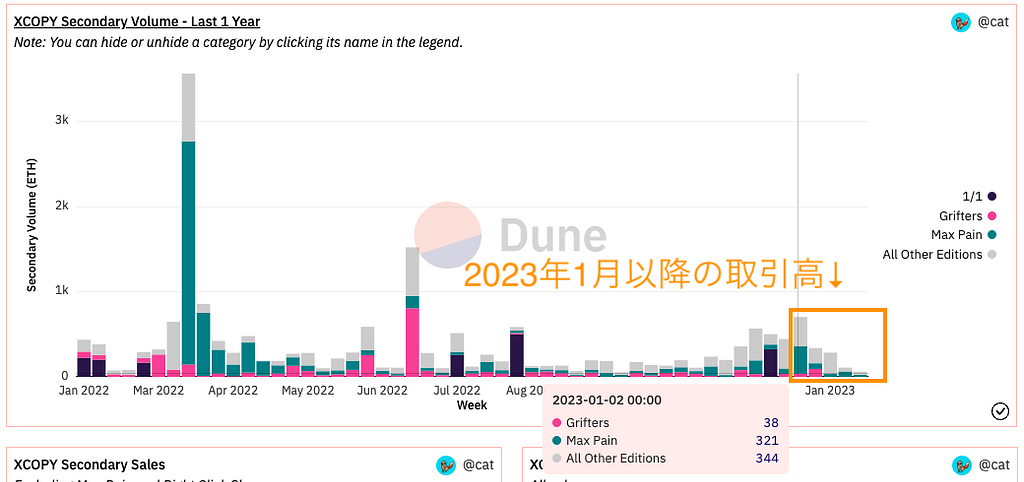 2022年後半から2023年1月後半にかけての取引は灰色(All Others Editions)が多くを占めている。それ以前の週あたり取引高の多くをグレー部分が占めている週が多いことを確認できる。