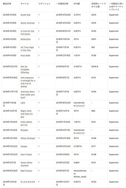 - 【2018年~2019年後半に制作、一次販売された1/1NFTの取引傾向】