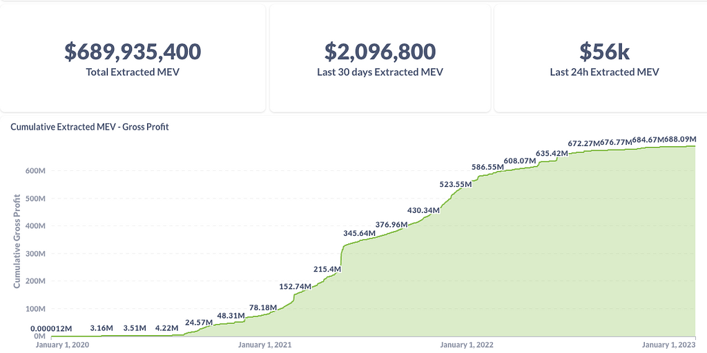 MEVによって抽出される利益の合計は着実にその規模を拡大しており、執筆時点では累計抽出金額は約6億8,900万ドル超であり、直近30日間ではおよそ200万ドルが抽出されています。