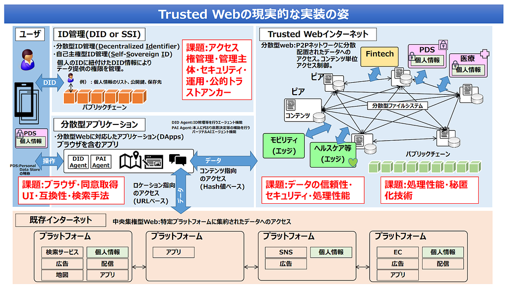 Trusted Webを簡単に説明すると、情報を一部の大企業が情報を一元管理したり、相互監視を行うのではなく、データ管理を帰属すべき個人や法人が行う分散型のWebを提案したものです。