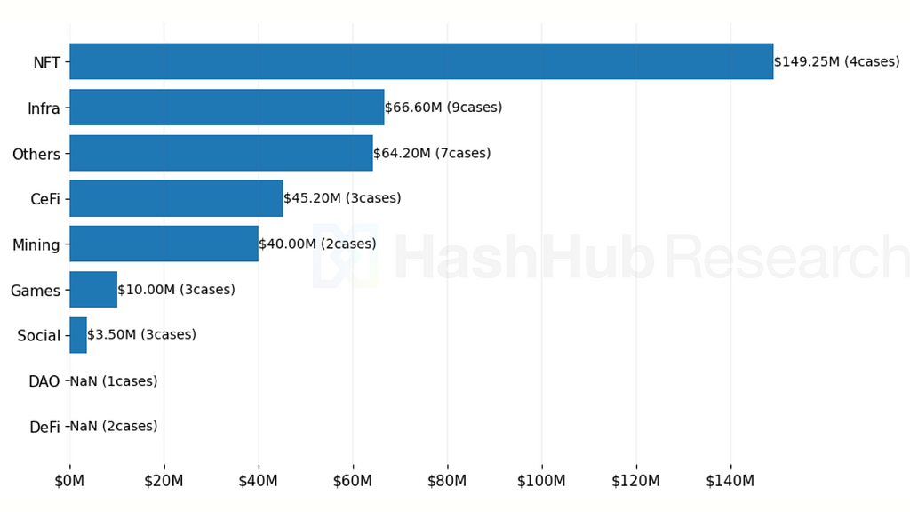 次に示すのは、この期間中における各カテゴリー別の資金調達額と、それに関連するプロジェクト数の概要です。このグラフは、Web3.0の資金調達における現在の動向を一目で把握するのに役立ちます。これを基点に、Web3.0の資金調達トレンドに関する洞察を提供します。
