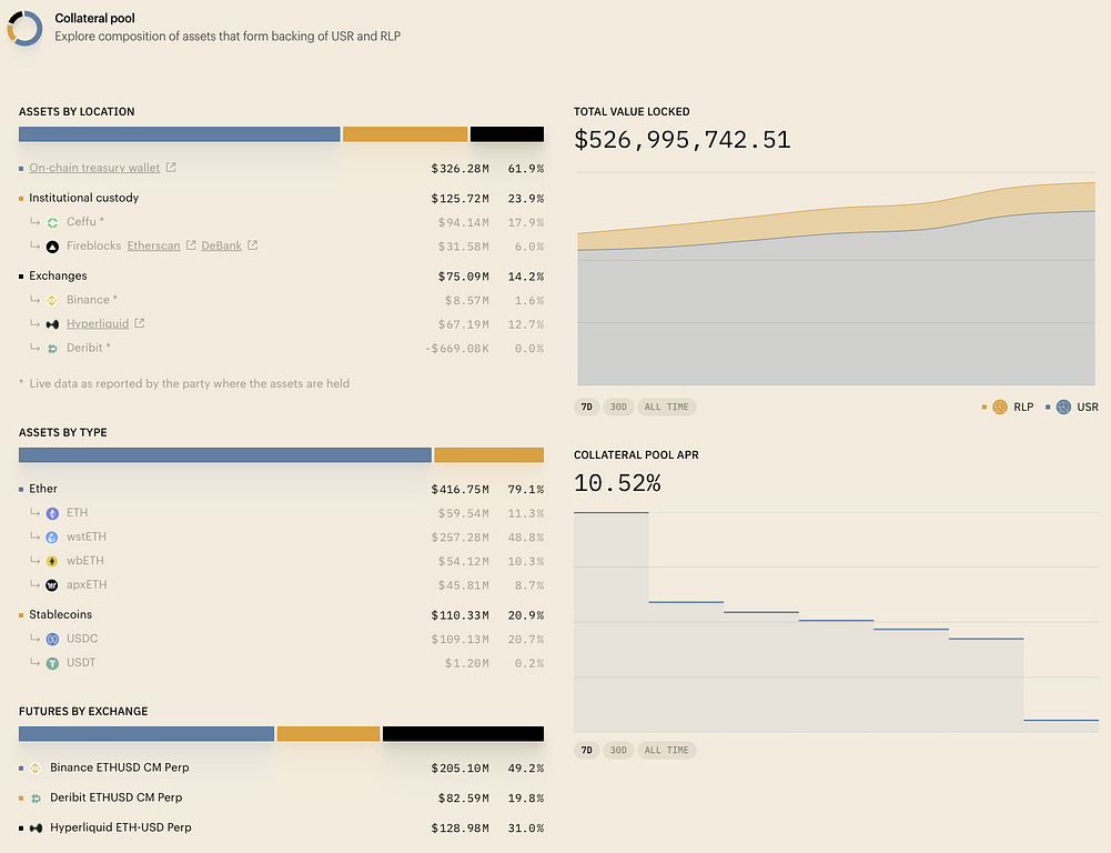 USRは、1ドルにペグするステーブルコインでETHを過剰担保として発行しつつ、先物ショートを組み合わせるデルターニュートラル戦略によって価格変動リスクを抑えてペグさせる構造をしています。また、RLPは、USRをペグを維持するためにプロトコル(ひいては投資家)が負担する損失リスクをカバーする役割のあるトークンです。