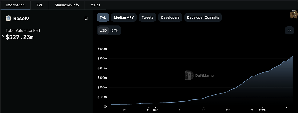 2024年12月頃よりTVLが上昇し始め、2025年1月現在でTVLは5億ドルを超えた。出典:DeFiLlama https://defillama.com/protocol/resolv#information