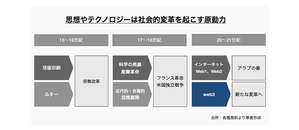 前提として、Web3には権力や力が集まりすぎた中央集権的な主体に対して、ブロックチェーン技術を使ってその社会課題を解決しようという動きがあります(諸説あります)。社会課題に対して技術を使って解決する運動は過去の歴史でも繰り返されており、15世紀にはカトリック教会の権威に異議を唱えたルターの思想が活版印刷で広がりを見せ、21世紀には中東のチュニジアで男性の焼身自殺動画がSNSで拡散されたことをきっかけに独裁政権が転覆されたアラブの春がありました。大手企業という中央集権的な主体は、分散性を重んじるWeb3とは相性があまり良くなく、工夫が必要です。