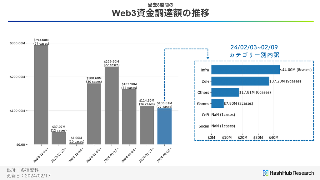 本シリーズでは、どのようなWeb3.0関連のスタートアップやプロジェクトに資金が集まっているのか、その最新の傾向とパターンを解説します。今回の#7では、2024年2月3日から2024年2月9日にかけての資金調達活動を調査し、どのカテゴリーが最も注目を集め、どのような特徴が見られるのかを分析しています。
