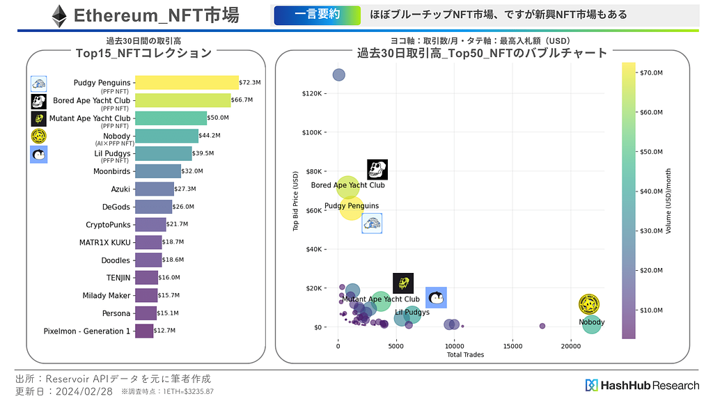 要はブルーチップNFTのような高価なNFT市場と比較的手頃で取引件数の多い新興NFT市場の両方が共存しているのがEthererumです。