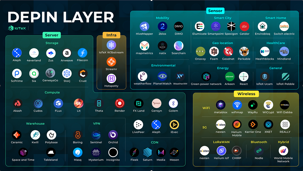 ※「DePIN」という言葉は、新たな技術や社会的変化に伴って生み出された新たな言葉(バズワードの一種)であり、インターネット上、ソーシャルメディア上で急速に広まり、多種多様な主観的解釈を通じて定義されつつある言葉ですから、「DePIN」という言葉そのものは未だ曖昧さを孕んでいます。解釈によってはBitcoinをはじめ、過去のさまざまな分散型プロジェクトをDePINに含むことも可能かもしれませんが、本レポートでは以下のカオスマップに示されるような「他称自称される」DePINをいわゆる「DePIN」と仮称します。