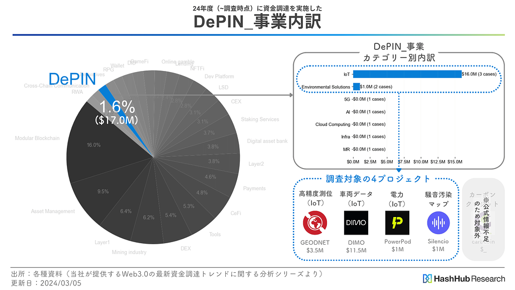 - 対象期間に資金調達を実施したWeb3関連プロジェクトのうち、DePINに関連したプロジェクトのみを抽出して調査。