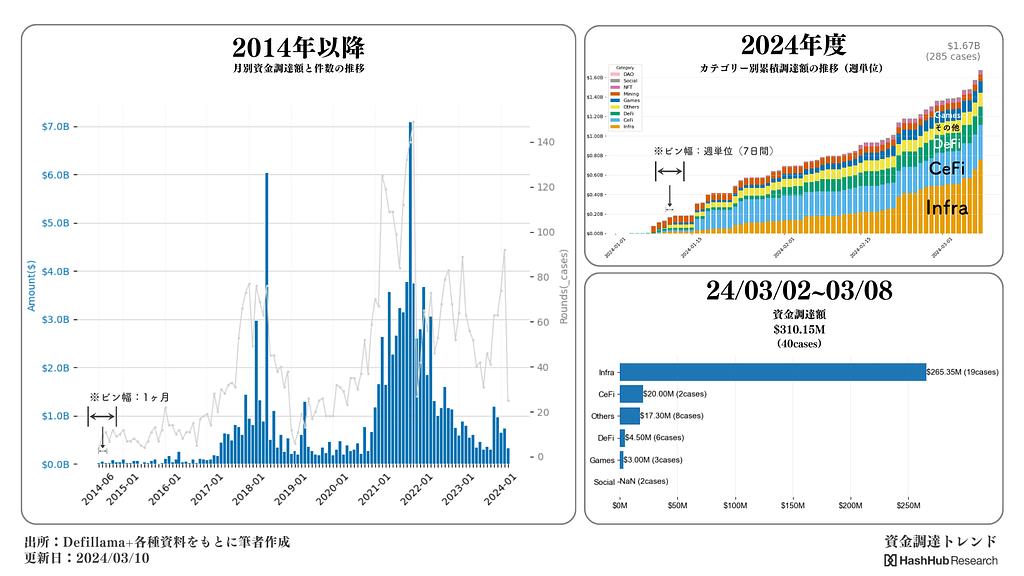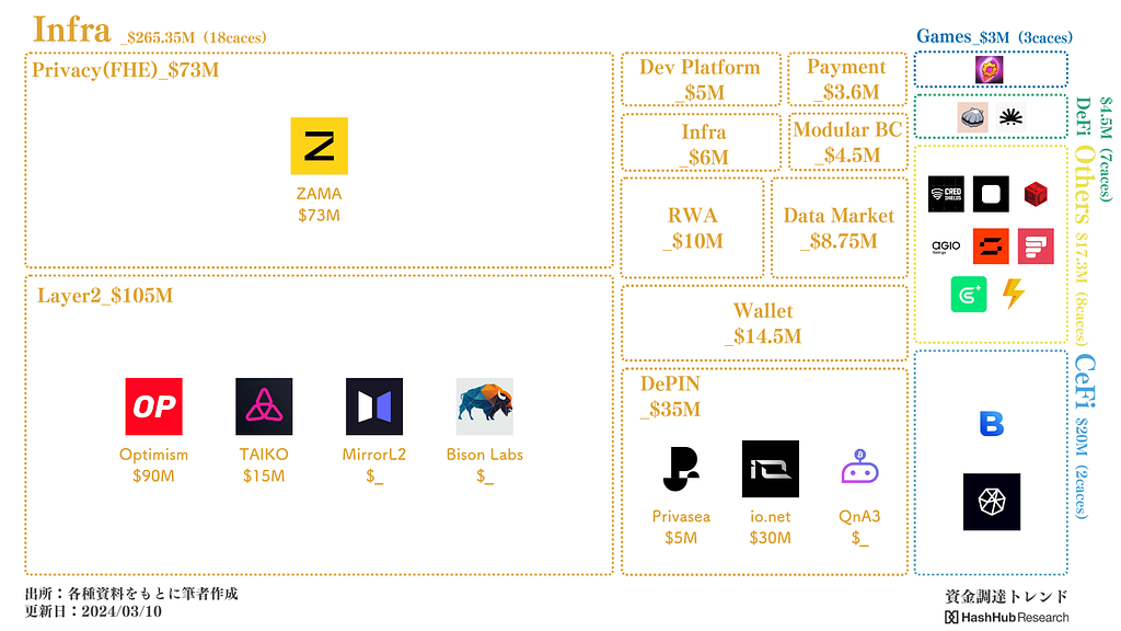 本シリーズでは、どのようなWeb3.0関連のスタートアップやプロジェクトに資金が集まっているのか、その最新の傾向とパターンを解説します。今回の#11では、2024年3月2日から2024年3月8日にかけての資金調達活動を調査し、どのカテゴリーが最も注目を集め、どのような特徴が見られるのかを分析しています。