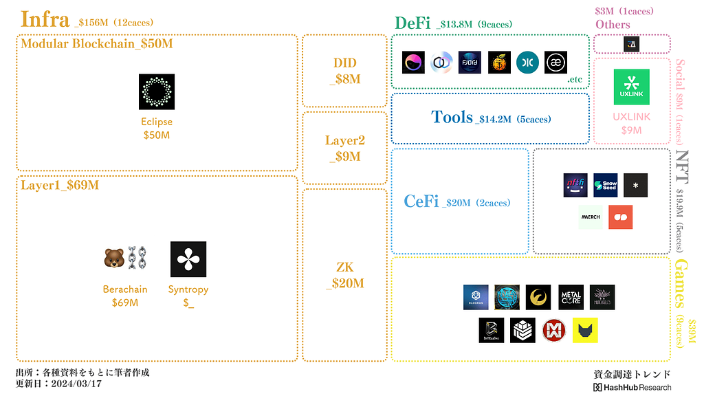 直近1週間は、インフラ関連の資金調達が引き続き活発であることに変わりはなく、今年テストネットを公開したばかりのBerachainが評価額$1.5B(ユニコーン)で$69Mを調達したほか、Solana Virtual Machine (SVM)を使用する初のEthereum Layer-2の開発を行うEclipseが$50Mの資金調達、Zkブリッジの開発を行うPolyhedraが評価額$1Bで$20Mの資金調達を行なっています。いずれのプロジェクトもクリプト界隈で大きな期待を寄せられている重要なプロジェクトです。