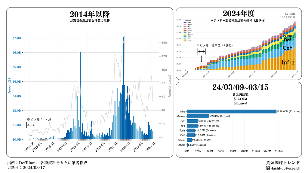 本シリーズでは、どのようなWeb3.0関連のスタートアップやプロジェクトに資金が集まっているのか、その最新の傾向とパターンを解説します。今回の#12では、2024年3月9日から2024年3月15日にかけての資金調達活動を調査し、どのカテゴリーが最も注目を集め、どのような特徴が見られるのかを分析しています。