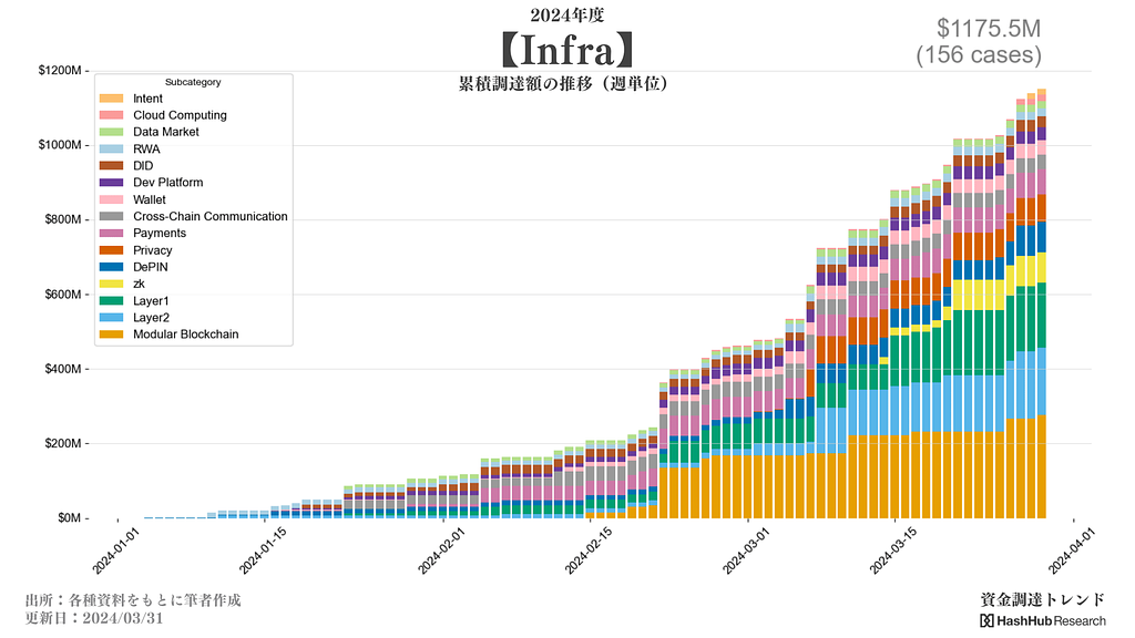 上記のグラフは、2024年1月1日以降、調査時点までのインフラセクターにおける資金調達の累積額を示しています。調査時点(#14)においては、合計で$1,175M、156件の資金調達が確認されています。特に、モジュラーブロックチェーン関連の資金調達が最も活発で、その後にLayer2、Layer1関連の資金調達が続いていることが分かります。
