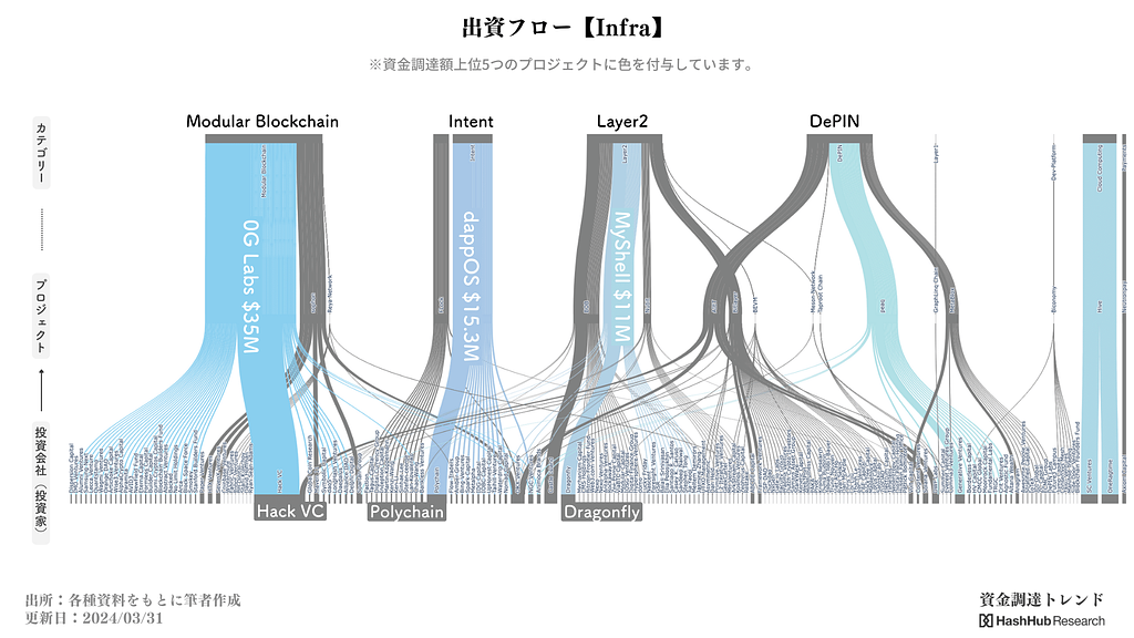 次のスライドでは、投資家とプロジェクトのカテゴリー間の出資フローに焦点を当てています。これにより、どのカテゴリーにどのようなベンチャーキャピタル(VC)が出資しているのかを把握することができ、市場の傾向や特定のVCの投資戦略を理解するのに役立ちます。例えば、モジュラーブロックチェーン、Layer1、Layer2などのカテゴリーに対する具体的なVCの関心や、出資額の規模が示されています。