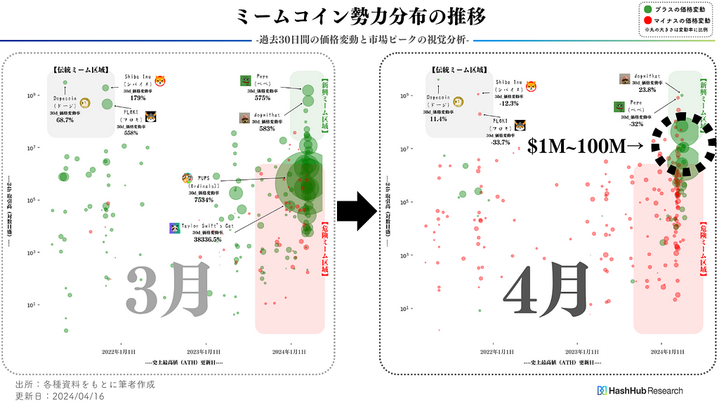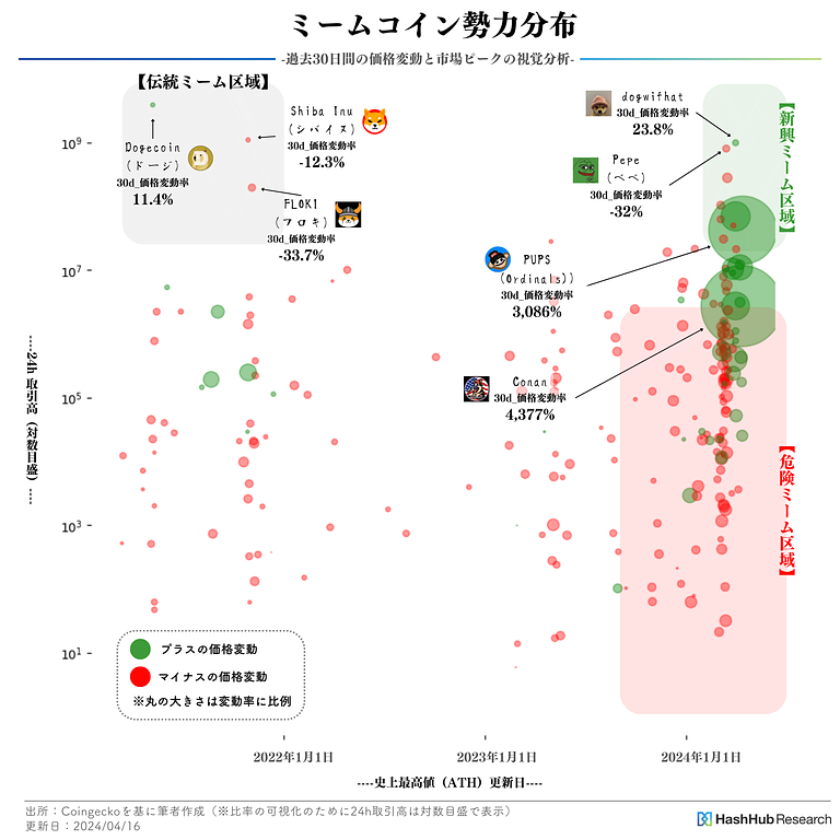 - 3月の市場が好調だったのに対して、4月中旬には市場の雰囲気が一変し、全体的に軟調になっています。それでも、新興ミーム区域下端から危険ミーム区域上端にかけて位置する一部のミームコインには活発な動きが見られることが確認できます。