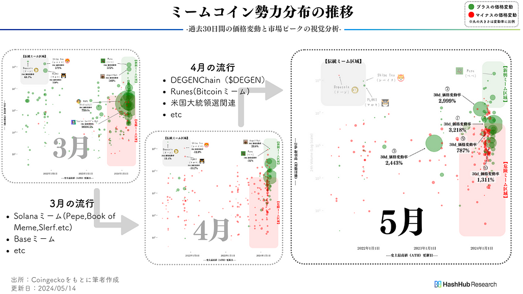 - 上スライドは3月、4月、5月の各月におけるミームコイン勢力の分布を表した散布図です。変化の激しいミームコイントレンドを把握する際にご参考いただければ幸いです。3月、4月のミームトレンドに関しては以下のレポートにて解説しています。