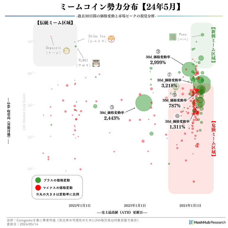 - 調査対象トークンを「24h取引高」および「史上最高値(ATH)更新日」に沿ってグラフ上にプロットし、「過去30日間の価格変動率の大きさ」を円の大きさで表し、正の変動を緑、負の変動を赤として表しています。