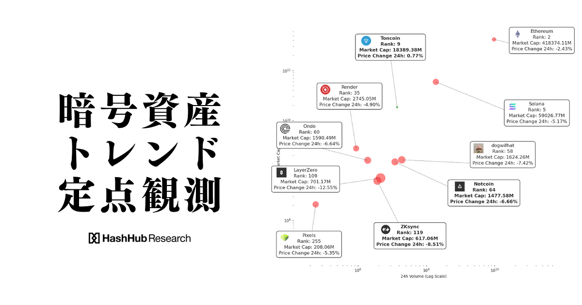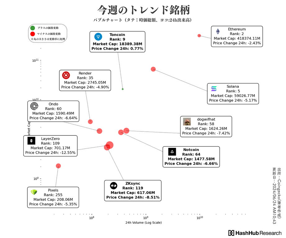 - バブルチャートについて:調査対象トークンを「24h取引高」および「時価総額」に沿ってグラフ上にプロットし、「過去24hの価格変動率の大きさ」を円の大きさで表し、正の変動を緑、負の変動を赤として表しています。