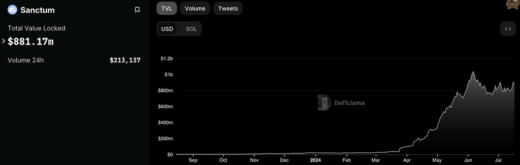 そのようなSolanaのDeFiエコシステムの中で、注目を集めているのがSanctumです。SanctumはSOLのLST(Liquid Staking Token)の流動性ハブとして機能し、2024年3月から執筆時点までの4ヶ月間で8.8億ドル以上の資金が預けられています。
