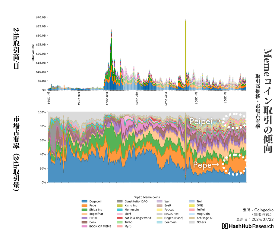 上は2024年1月以降のミームコイン取引量及びその内訳を示した棒グラフおよび100%積立面グラフです。特に取引量の多い上位25銘柄にはユニークな色を付与し、それ以外はOthersとして灰色でまとめています。