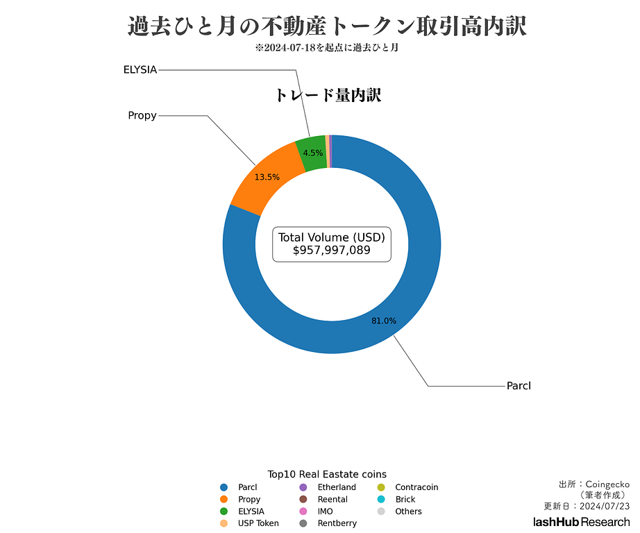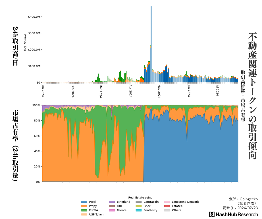 4月前半まではPropyとELYSIAの取引高が全体の9割近くを占めており、残り1割近くをUSP TokenとEtherlandが占めています。