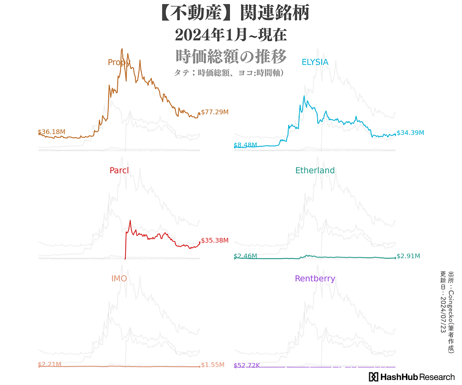 いずれも3月から5月にかけて時価総額を伸ばしていますが、時価総額上位に位置するPropy、ELYSIAは現時点で年始よりも時価総額を伸ばしている一方で、IMOとRentberryは時価総額は減少。また今年ネイティブトークンをローンチしたParclはわずかに時価総額を増やしたEtherlandを抑えて時価総額3位につけています。