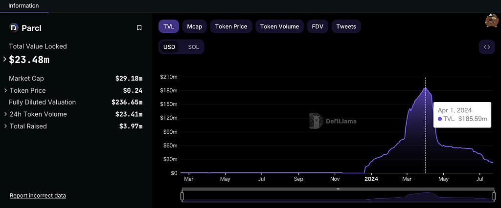 一方、4月後半からは同時期に独自トークンをローンチ&エアドロップしたプロジェクトParcl($PRCL)が8割近くを占め、残りの2割近くをPropyとELYSIAが占めています。なお、エアドロップ後の大規模な売り圧によりParclプロトコルのTVL(DeFiLlama参考)は激減。時価総額も減少傾向にあります。(下図参考)