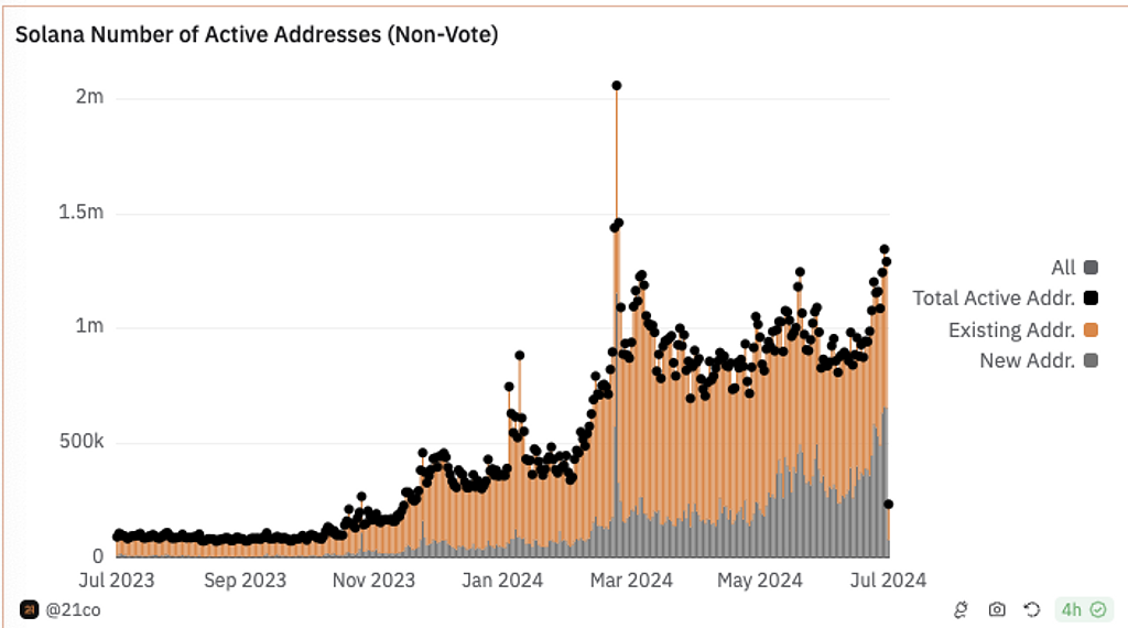 2023年10月から、アクティブユーザーは増加傾向で、新規アドレスも増えています。これらの背景としては、以下のレポートにて解説しています。