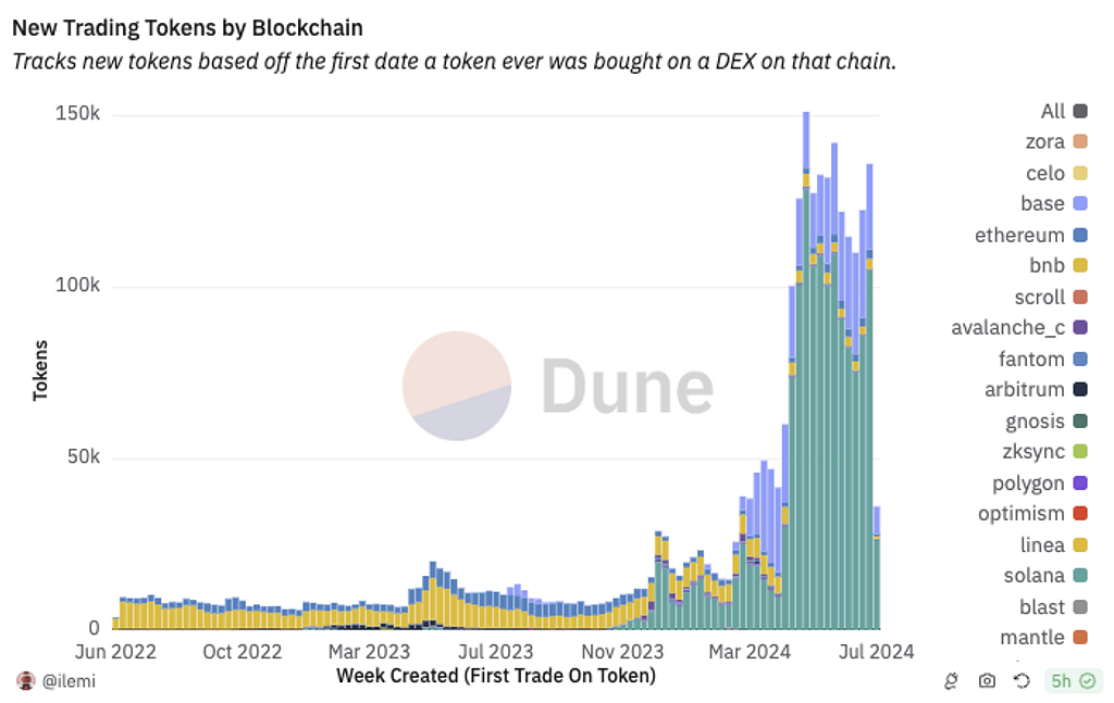 以下のグラフは、チェーン上のDEXでトークンが初めて買付された日付に基づいてトークン量を計測しています。Solanaで新規トークンが異常なほど発行されていることが分かります。