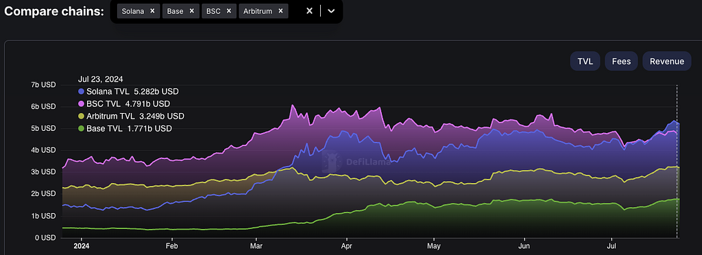 比較対象をBSC、Arbitrum、Baseとしています。6月は全てのチェーンでTVLの減少傾向がありますが、7月からの上昇局面でSolanaの上げ幅が他のチェーンを上回っている傾向が分かります。