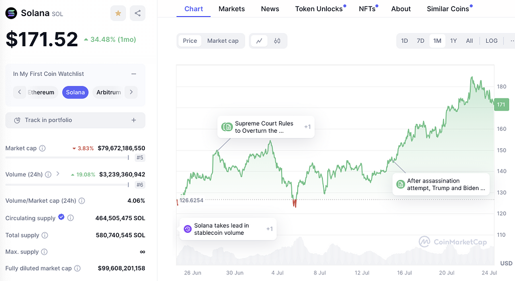 SOLの価格が上昇しています。7日前から執筆現在では、およそ5%の上昇です。1ヶ月前は126ドルだったのに対し、直近の高値は184ドルにタッチしており、30%以上の上昇を記録しました。