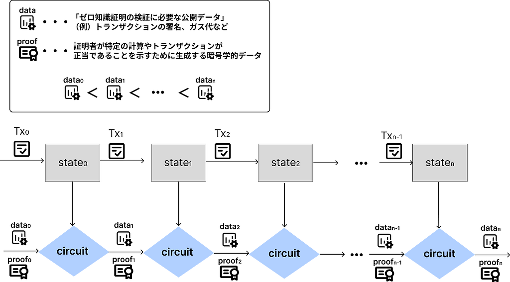 再帰証明とは、zkSNARKで作成したProofをさらに検証するcircuitを構築することで再帰的に証明を生成し、一つの証明にしてしまうというものです。再帰証明を用いることで、ブロックチェーンのstateの移り変わりをまとめて1つのproofにして証明することができます。以下の図では、ブロックチェーンのstateと、正しくstateが移り変わっていることを示すdataを用いてProofを作成しています。Proof_0はstate_0に正しく遷移したことを示し、Proof_1はstate_0 → state_1と正しく遷移したことをProof_0を用いずに証明します。これを再帰的に繰り返すため、Proof_nはstate_nまでの遷移全てが正しく行われたことを証明できます。
