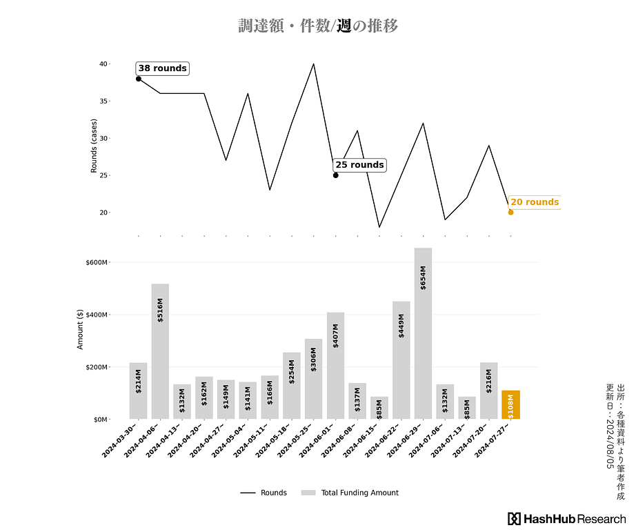本シリーズでは、どのようなWeb3.0関連のスタートアップやプロジェクトに資金が集まっているのか、その最新の傾向とパターンを解説します。今回の#32では、2024年7月27日から2024年8月2日にかけての資金調達活動を調査し、どのカテゴリーが最も注目を集め、どのような特徴が見られるのかを分析しています。