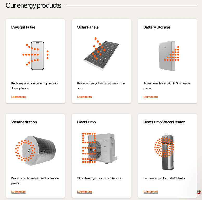 専用のエネルギーデバイスは上画像の通り。エネルギーモニター(Daylight Pulse)、ソーラーパネル、蓄電池等を確認できます。