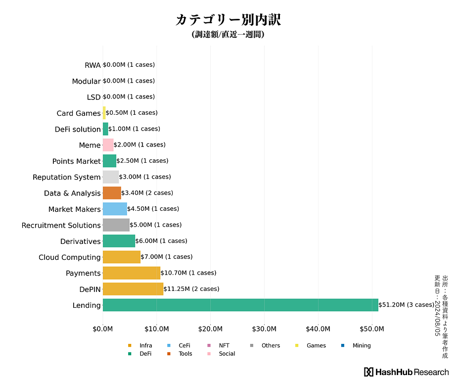 この期間中、公開された資金調達額ではDeFiセクター($60.7M)、インフラセクター($28.9M)、その他セクター($5M)の順に大きく、件数ではDeFi(8件)、インフラ(5件)、Tools(2件)の順に多くの資金調達報告を確認しています。