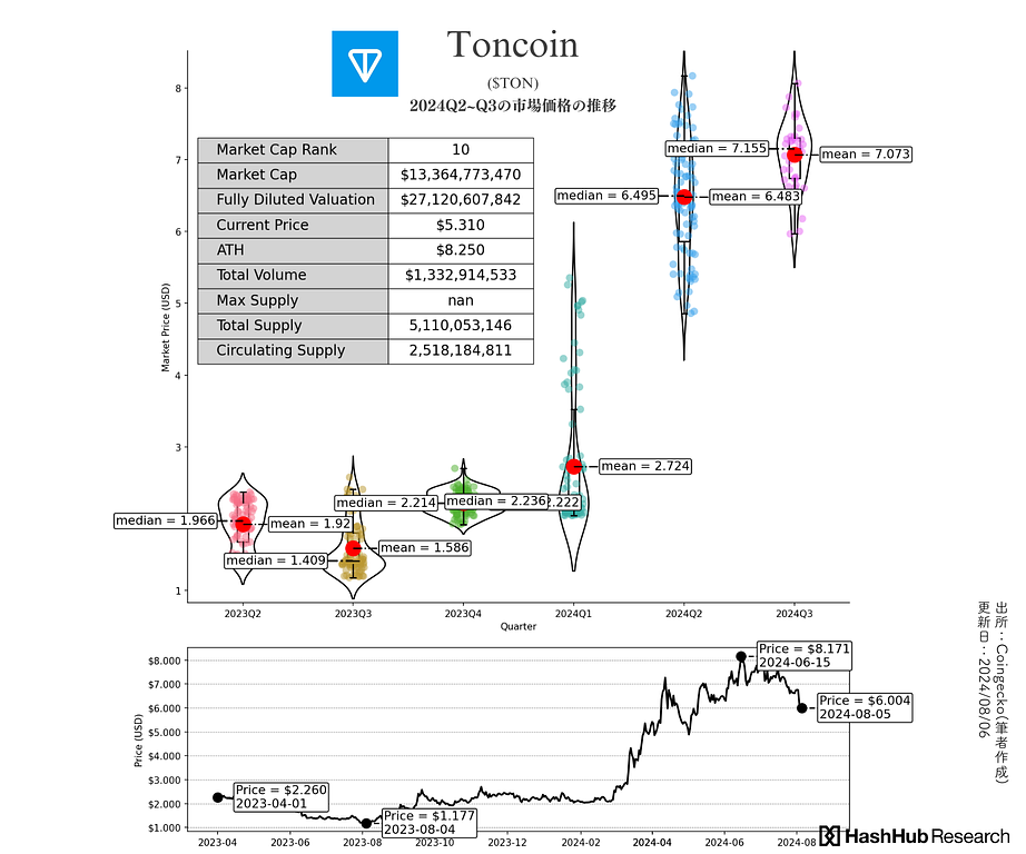 $TONの市場価格は明確な出来高増を観測し始めた2024年3月(2024Q1)を境に急騰。その後、2024Q2~Q3にかけて中央値$6.495~$7.155を推移。