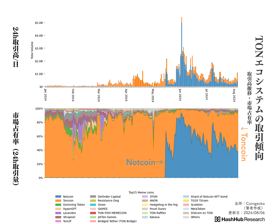 一時、Notcoinの出来高が市場をほぼ支配をしていましたが、執筆現在ではネイティブトークンであるToncoinとNotcoinの出来高が同じくらいの割合で市場全体の9割以上を占めています。
