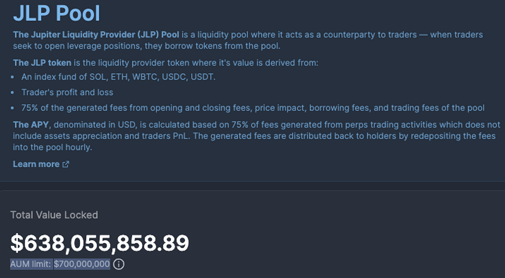 JLPの実際の市場価格は、仮想価格に市場プレミアムが加わることで決定されます。JLPプールのAUM(Assets Under Management)が制限に達すると、新しいJLPトークンの発行が制限され、その結果、既存のJLPの市場価格が上昇する可能性があります。
