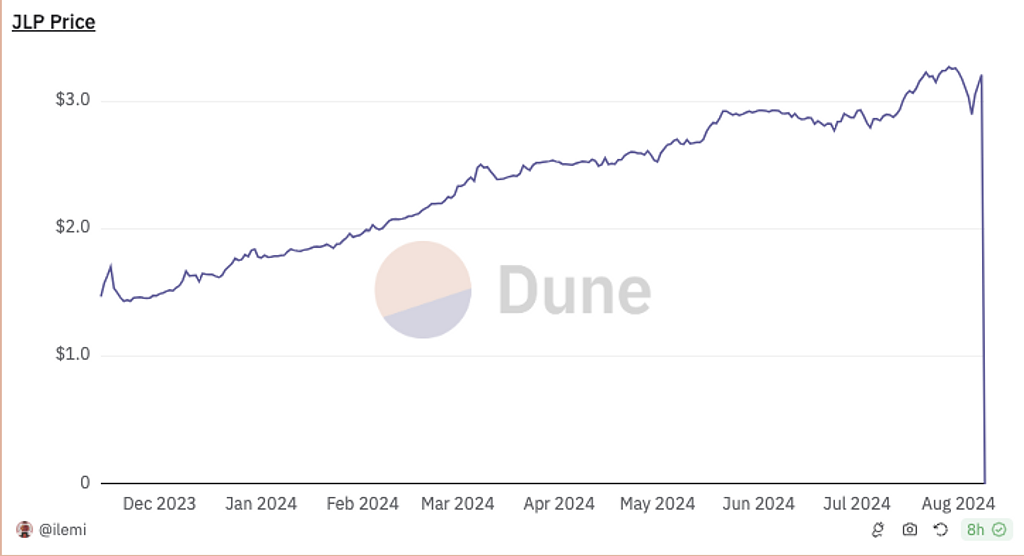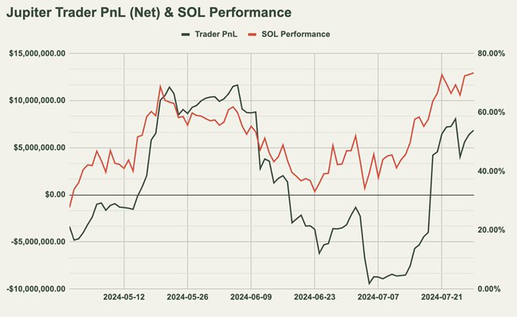 なお、トレーダーの利益がJLPの損失になるという説明をしましたが、2024年からSOLとJupiterの無期限先物取引のトレーダーの損益がプラスであっても、上記添付画像の通りJLP価格が上昇基調を維持していた点も興味深いといえます。