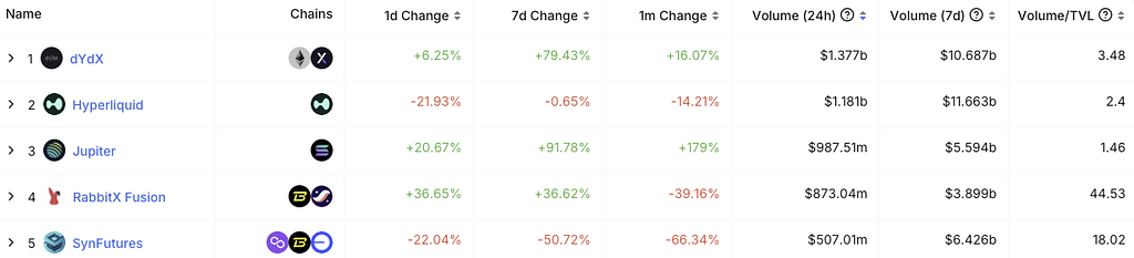 執筆現在のDeFiLamaによれば、JupiterはSolanaの中で6番目のTVLであり、無期限先物取引市場の取引量は、dYdXとHyperliquidに次いで3番目です。