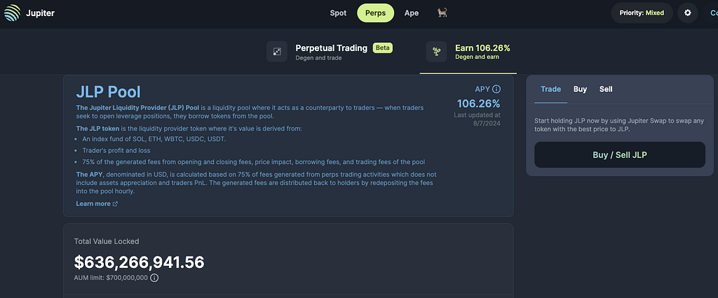 JLPの運用として最もシンプルなのは、JLPをJupiterで購入しホールドすることです。これだけで、プロトコルからの収益が反映され再投資された利回りがJLP価格に反映されていきます。