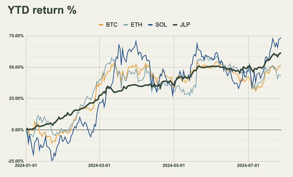 JLPの興味深い点としては、YTDでのパフォーマンスです。以下のグラフは、SOL、BTC、ETH、JLPでYTDでの上昇率を重ねて示しています。JLPはSOLよりもやや劣りますが、BTCやETHよりもパフォーマンスが良いことが分かります。