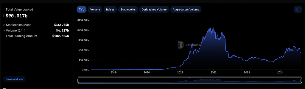 しかしながらそのDeFiの市場は過去3年間停滞しています。スマートコントラクト内で流通総額を示すTVLも伸び悩んでいます。