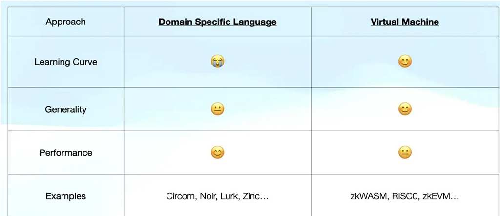 上図では、アプリケーションに必要なロジックに合わせて回路を実装するDSLと、仮想マシンそのものを回路に落とし込んで実装するzkVMとの比較を行っています。