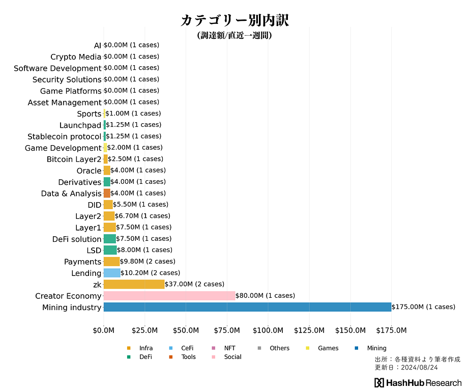 より細かな分類(上図)では、マイニング産業($175M/1件)、クリエイターエコノミー($80M/1件)、ゼロ知識証明技術($37M/2件)関連に比較的多くの資金が流れていることを確認できます。