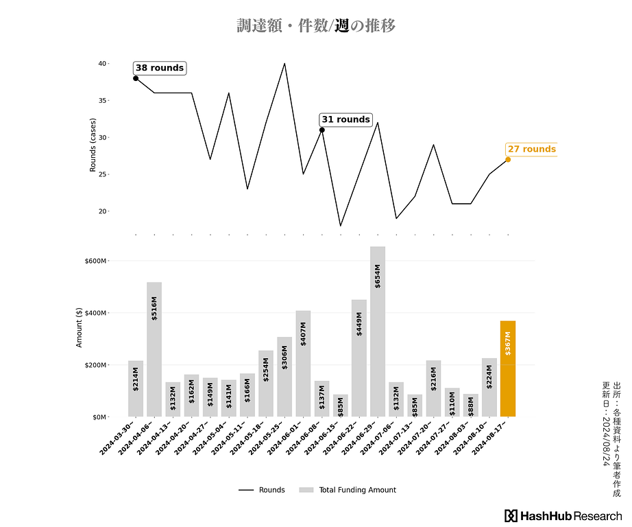 本シリーズでは、どのようなWeb3.0関連のスタートアップやプロジェクトに資金が集まっているのか、その最新の傾向とパターンを解説します。今回の#35では、2024年8月17日から2024年8月23日にかけての資金調達活動を調査し、どのカテゴリーが最も注目を集め、どのような特徴が見られるのかを分析しています。