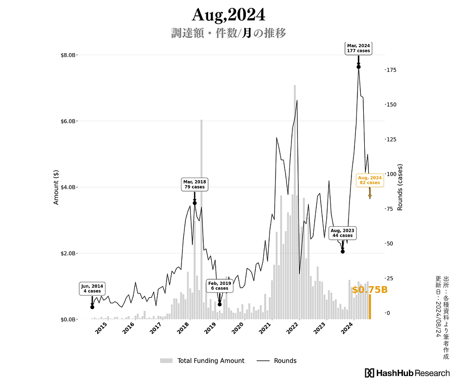 調査時点で観測している8月の投資ラウンド件数は計82件、公開情報に基づく調達額は約$0.75B(※非公開情報を含まない金額)の資金調達報告を確認しています。