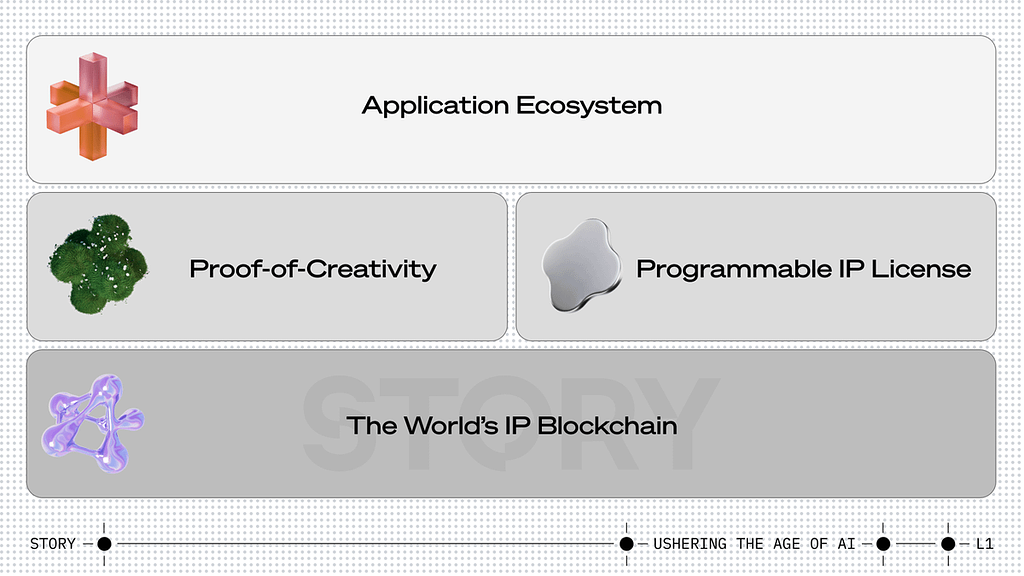 Storyプロジェクトは、①Story Network(レイヤー1ブロックチェーン)、②Proof-of-Creativity Protocol (スマートコントラクト)、③Programmable IP Licenseで構成されるIP(知的財産権)の分散型管理の実現を目的としたプロジェクトです。