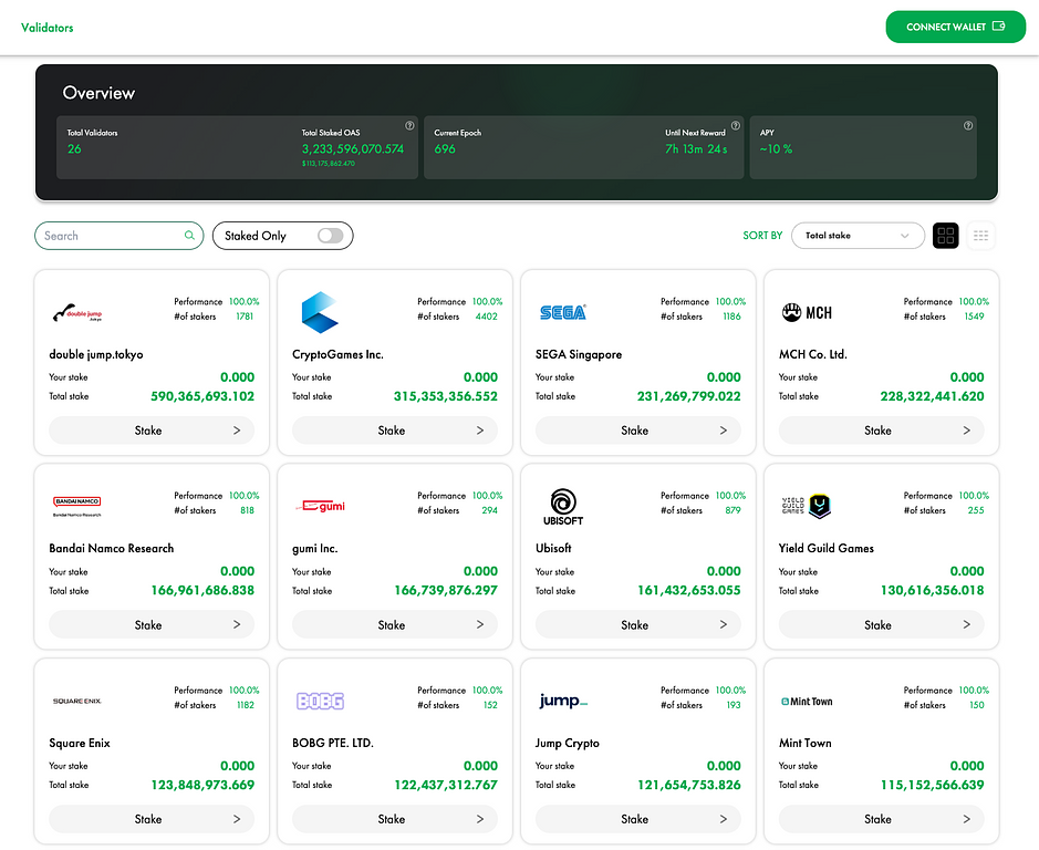 Oasysは、調査時点でバンダイナムコResearchや、Sega、Square Enix、Ubisoft、Yield Guild Games、KDDI、Rakuten Wallet等々の計26のバリデーターが参加するGameFiエコシステムに特化したマルチレイヤー採用のブロックチェーンネットワークです。